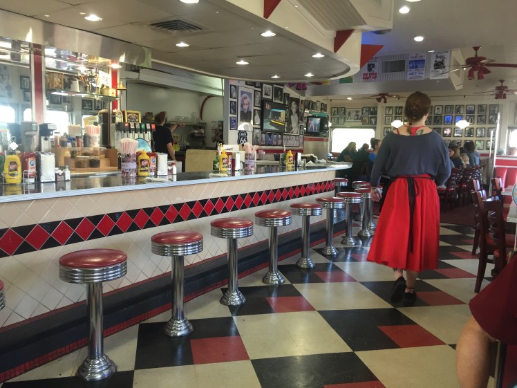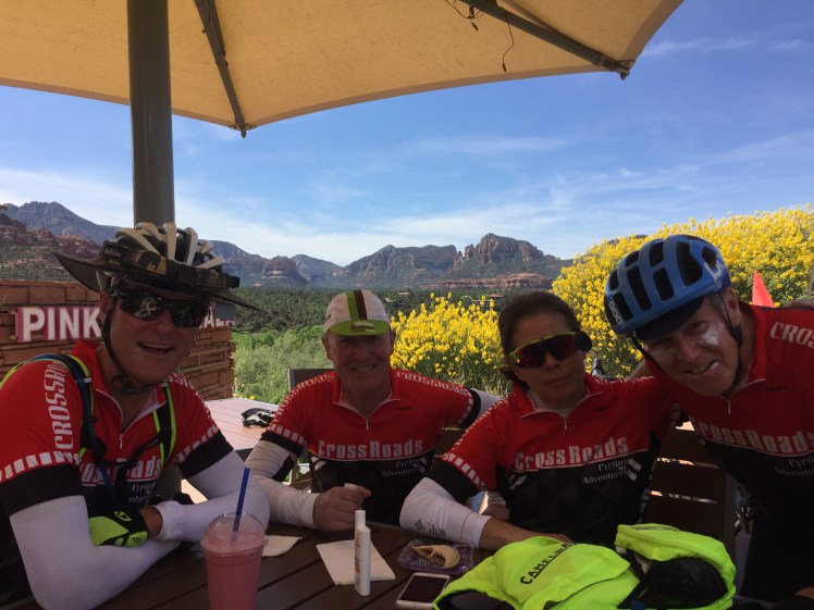 May 14-15. Rest day finally. Yesterday, I would describe as beauty and the beast. Started as a steady climb then magic– the outskirts of Sedona. God had his best paints and brushes saved for here. We stopped just into town for a smoothie- peach and banana but I paid for that pleasure – serious hypoglycemia after . See if you spot Americas favorite beagle, Snoopy in the photo I took there.you’ll also see a shot of 4 of us sitting around – Kevin  and Mary are on the right andboth back in the game- after their fall on the way into Wickenberg. The beast today was – it was Saturday, and the climb out of Sedona to Flagstaff goes thru Oak Creek Canyon- beautiful, tortuous 12 mild climb with Slide Rock, a natural water slide, on the left which was full of funseekers. It’s max stress for cyclist like us though.There is a single white strip separating us from gravel or a steep descent into trouble. And I got my 1st flat out there! Thanks to buddies with me – especially Sabine – a terrific cyclist from Media, Pa. – the change went smoothly. Got to Flag the day NAU had graduation so the town was hoping! Flagstaff is a cool place . Mix of old West timber, railroad and ranching with a modern change into an outdoor lovers paradise. I just finished a phenomenal sports massage with Angela Gavelli – if anyone is here check her out 1(928)853-2504. She said Flag has become a major training site for Olympic teams world wide. At 7200 ft it is the ideal altitude. She worked on the Olympic swim teams from Israel and Turkey this weeks alone !One of the Brits – Howard -wanted a real American diner experience. Check it out poodle skirts on Rt 66  – The Galaxy diner . There are more photos here of old movie scenes and stars than in Hollywood itself! One of the photos shows the thru Oak Creek Canyon from above. Rest day tomorrow in Flagstaff- yeah!