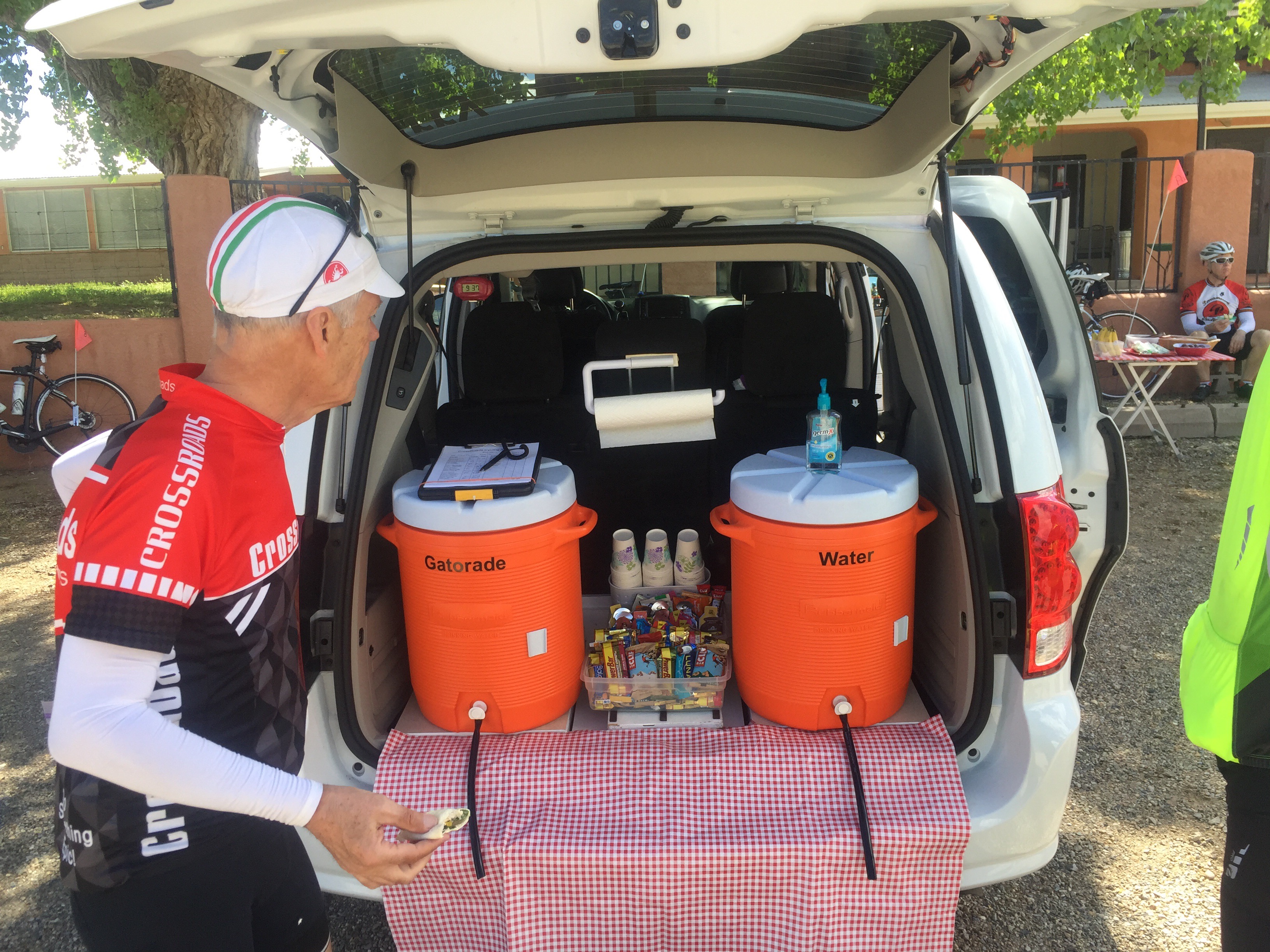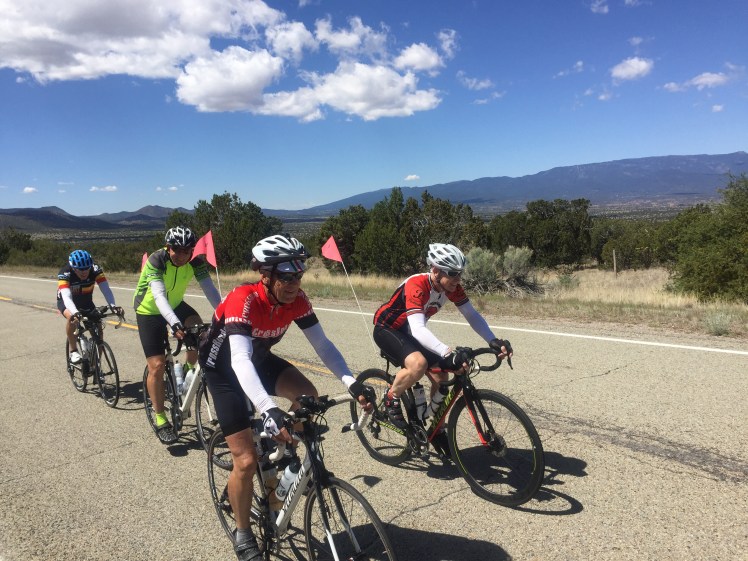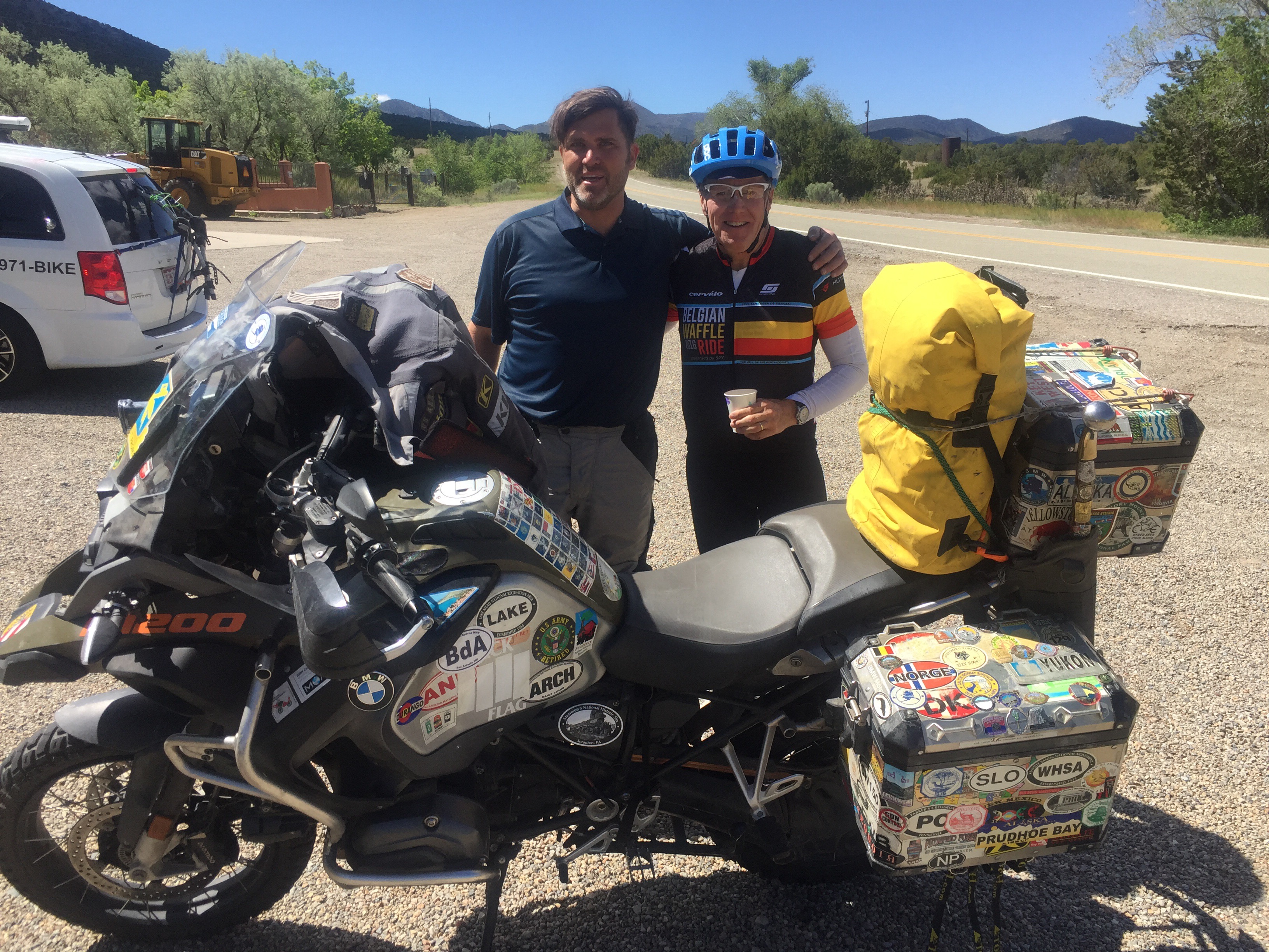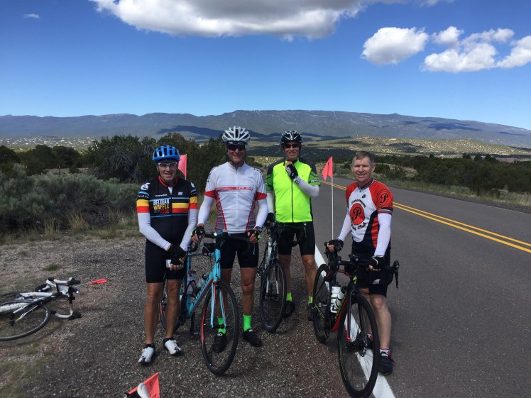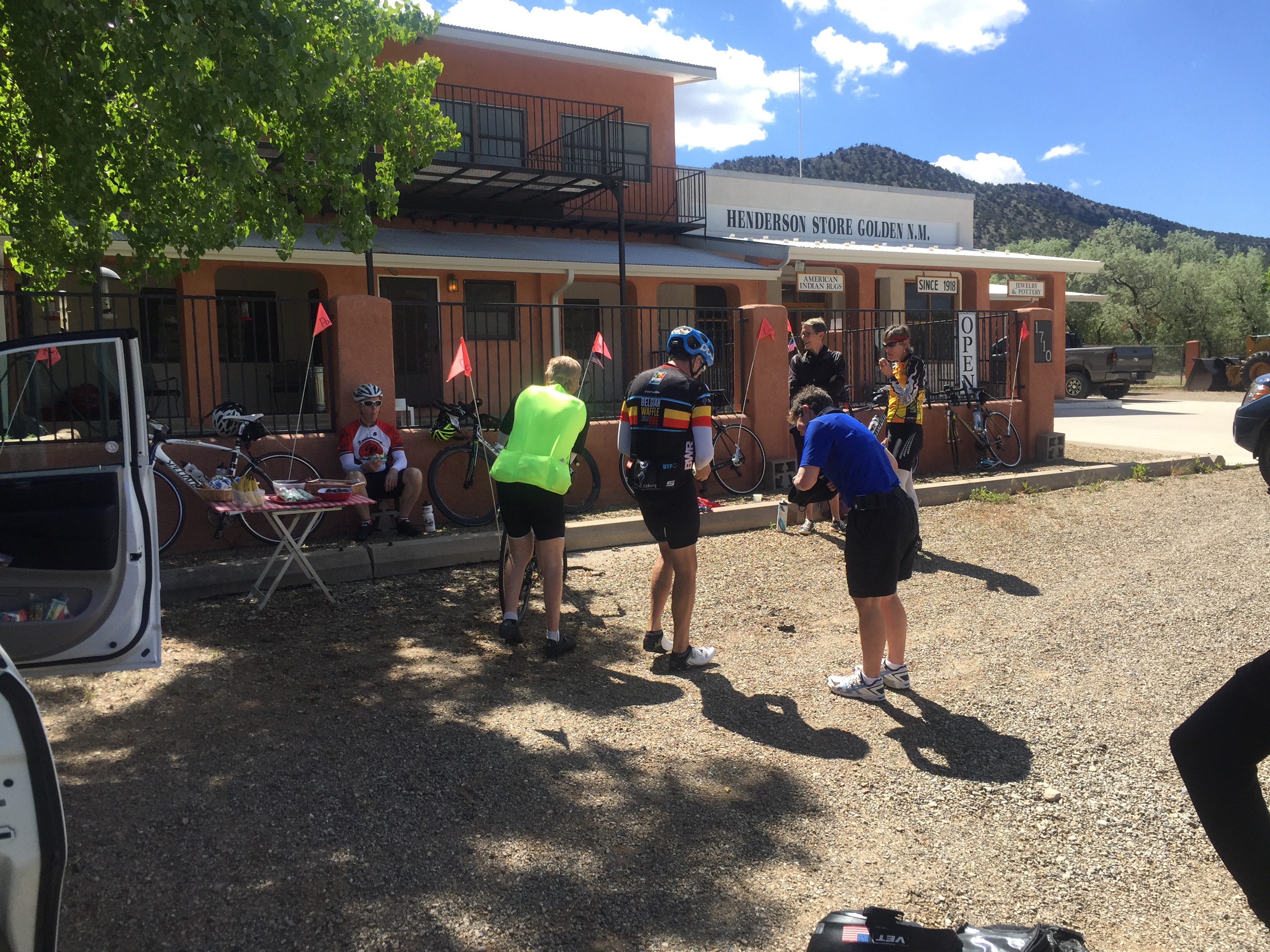 5/20/2016: another beauty! single layer cycling clothes all day , with temps in the 59-85 range.I could happily avoid most of Albuquerque but as you leave town  views of big, open high-desert vistas and distant rock formations await! Most of the morning was spent climbing- we ascended approx. 5400 ft today. We traveled along what is known as the Turquoise highway. The road is dotted with little towns that reflect the areas transition from mostly mining of coal to support the railroad industry and mineral mining. Spent the day w some buddies riding easy and together-Ted,Steve, Kevin, Paul and myself. Great SAG break at the Henderson stor in Golden, NM. we have a new member of the support team named Carol who is a gourmet cook and does wonders  with spinach, peppers, chicken and a sauce that makes a mean burrito! While at the SAG we met a guy with a outrageous BMW motorcycle  who literally has taken his fully outfitted bike from Prudhoe Bay,  Alaska to So. America and all of Europe and into the Middle East- looked like a tempting way to travel in the future! Lunch was in Madrid- which is  a hippie throw back of artists, metal workers,  bead makers and funky restaurants. We ate at the mine shaft restaurant which also acts as a museum and outdoor entertainment site. As you guessed the coal and mineral mines are inactive but resourceful people make great things happen. It was marvelous to not be on a tight schedule. This was a fun, kicked back day!  Check the photos for a feel of it!