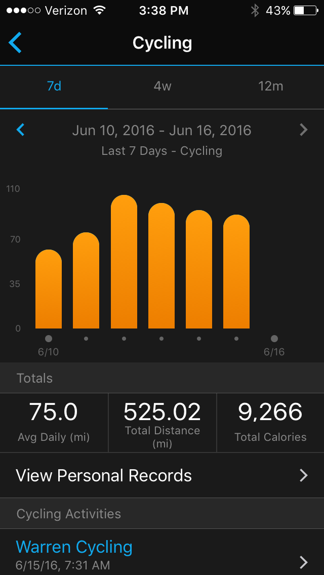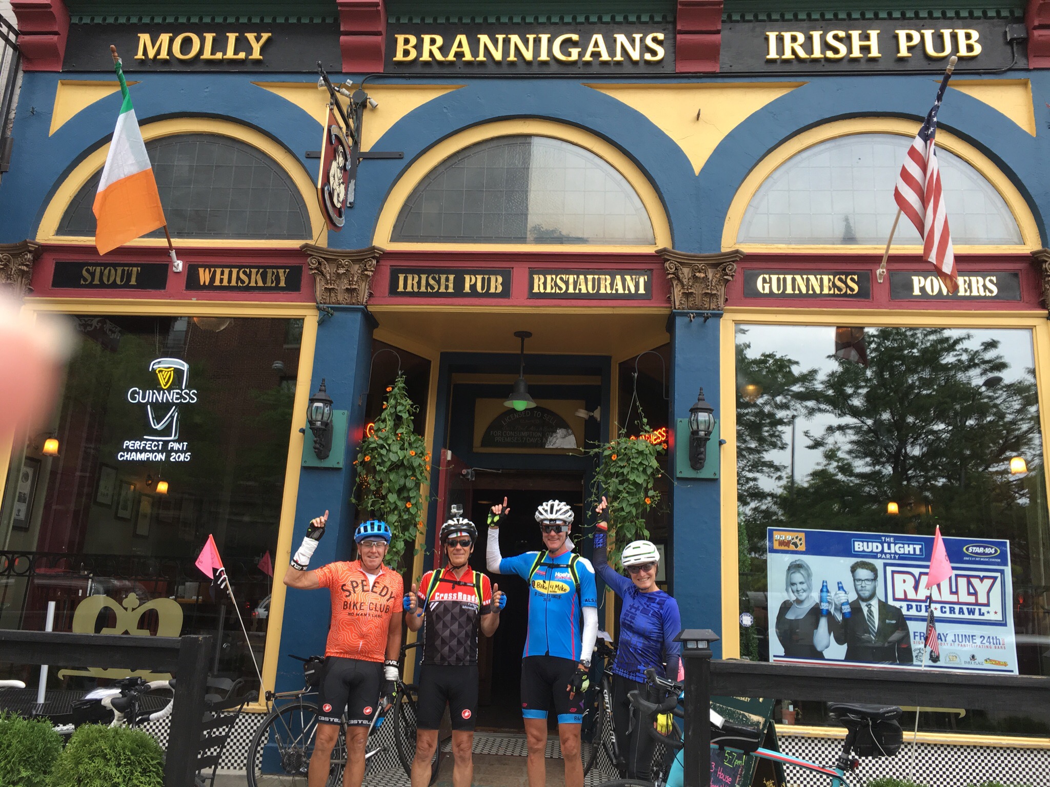 6/16/2016-Thurs : now I imagine everyone thinks I’m including the day of the week lately just as a part of good blog manners, how does it sound if I confess it is just to keep me oriented to the day of the week or else I’ll forget? Time is taking on a new dimension when you are focused on one physically demanding activity like this. But fear not– this is not the start of a twilight zone storyline!! Sad to say our visit into my home state will be limited to a single day in Erie. Seems like a cool place but most of us just need a day to chill out, do things like wash the laundry, clean up and oil down the bike, reconnect with family and friends and rest. I may be taking an afternoon nap today– think of that!! I’ve included a photo of the summary of our last 4 weeks of riding- we are all laughing because there is no way you could convince any of us to leave the house at home and ride 99-105 miles every day for 4 days like we have these past 2 weeks. The impact of setting a goal and heading towards it, is a powerful force indeed! Hope everyone is enjoying the blog, it’s been really fun reconnecting!! This final week we head east into New York with stops in Hamburg, Canandaigua, Syracuse, Herkimer, and Latham – I’ve never been in any of these towns.We finish the ride via Brattleboro, Vt (lots of hills from what I hear) then on to Burlington, MA and into Boston 6/24 for a dip of the tires in the Atlantic!! We have a final farewell dinner with families and friends that evening– anyone want in? Let me know!! I can’t wait to see Denise- a really good hug and a smooch on the cheek — stuff of dreams isn’t it!! If you can’t make it up here no problem, just ride along with the blog and I’ll keep on reporting-ah- it is Thursday, right!! Don’t worry Jim Hay — it ain’t dementia, just the rider zone we’re traveling in!!