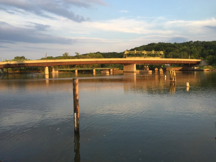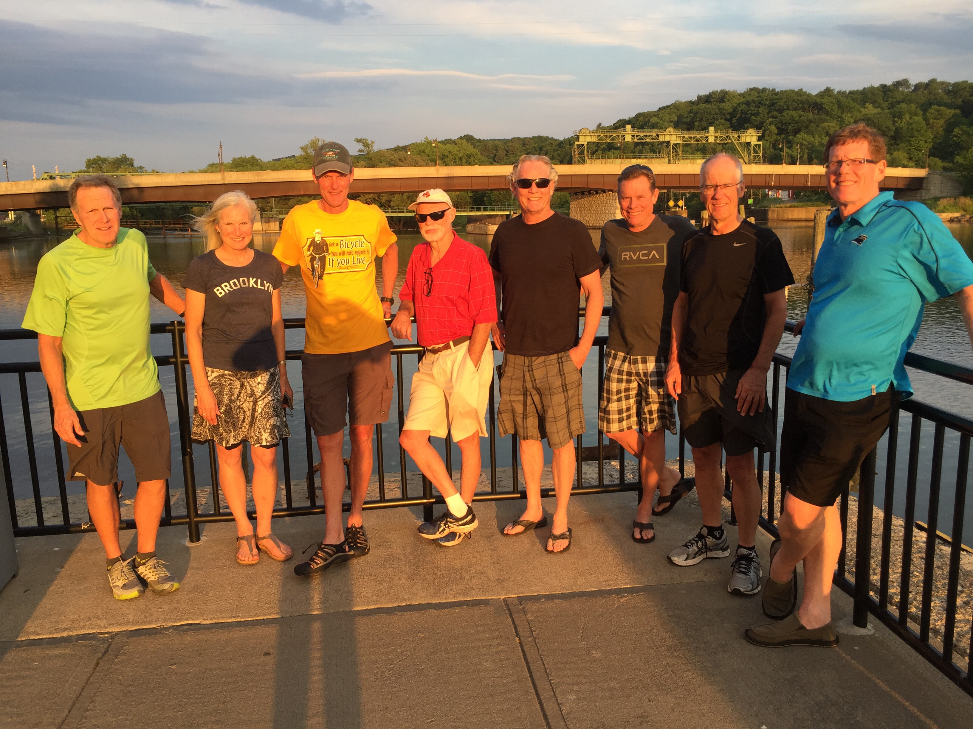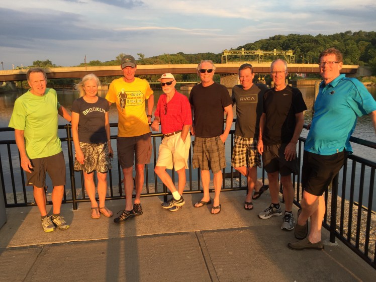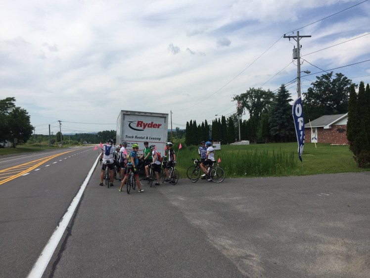 6/20/2016: Happy first day of summer! My buddy Paul informed me that we are not only experiencing summer solstice but also a full moon tonight- a rare combination and often called the strawberry moon! It’s getting cloudy here in Herkimer so if anyone happens out and does see this rarity– send us a photo!! It was a great riding day but hot and humid weather dominated the day. My good friends from So Cal and brothers, Craig and Brent Riker came into the area to basically accomplish 2 things– see their brother Dale and his wife Barb who live in Brattleboro, Vt., and to ride with our group for 3 days . Mission accomplished today! The new guys jumped right into the ride and as the day progressed everything heated up! A bit of testosterone and ego mixed with good competitive fun and wala– a nice, quick last 25 miles ended today’s ride. Everyone was drenched, dry of mouth,red of face and wearing smiles — It was a cyclist dream ending to a terrific biking day! When you are moving that fast pictures are at a minimum, but I have a few of the countryside and the Mohawk River — Erie Canal and one of the locks in Herkimer. I also want to share how this blog is reconnecting me with good friends and bringing back memories for them. One of my good buddies and Med school classmates – Gary Agia is riding along with the blog and yesterday I posted a photo of Camillus NY and mentioned the Erie Canal path we were riding along. Well Gary commented back that he lived there in Camillus from 4th grade to soph HS , fished the canal, and that his father owned a grocery story on Main St.!! How is that for stirring up some really great stuff, thanks Gary! The herd of riders in the photo below is everyone stopped to figure out a surprise road closure– once the road changes were figured out the Peleton really let loose, but not before 2 really strong women riders, Mary Claire and Barb (alias Laverne and Shirley) just sped past all of us and casually screamed “what’s the big hold up boys??!!Or some words to that effect-!!!