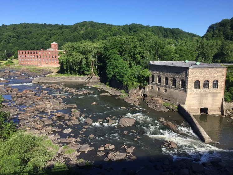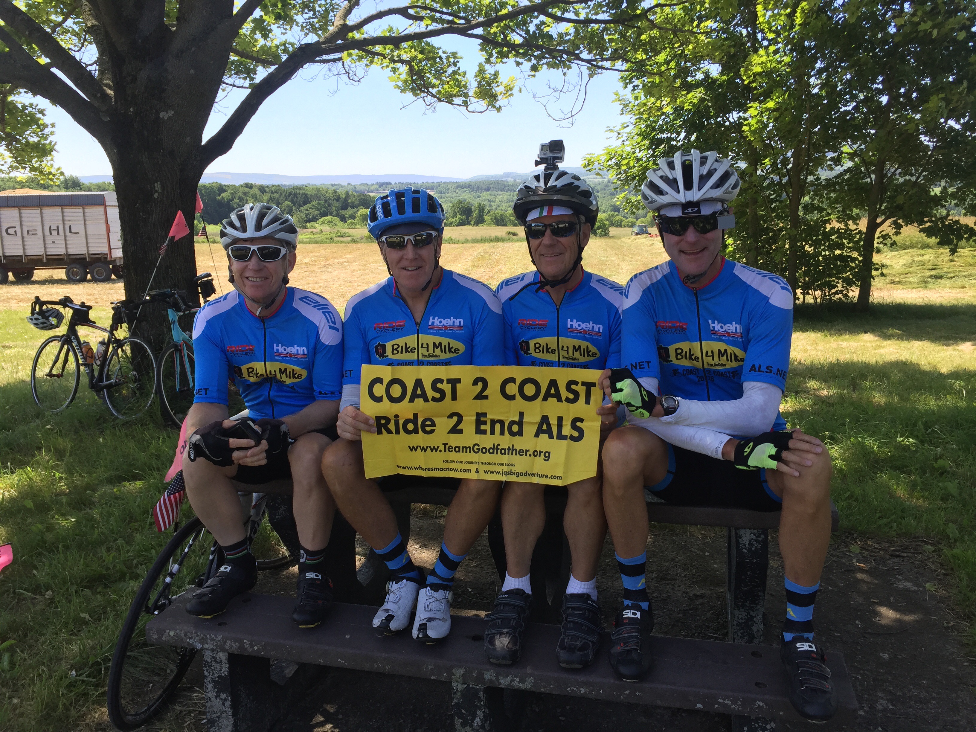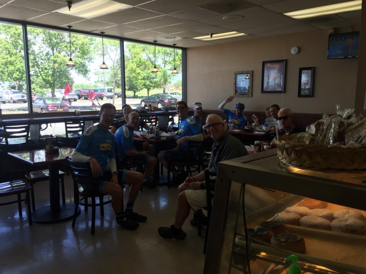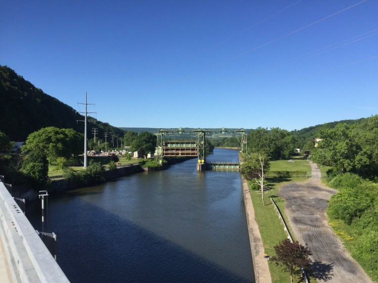 6/21/2016-Tuesday: We had thunder, lightening and minimal rain overnight but awoke to a much cooler morning with clear skys and again trailing winds! We Saw our first good example of the locks along the Erie Canal and Mohawk River when we enteredLittle Falls about 7 miles into the day . I hope the photos do justice to the beauty of the River and the area. The whole day was spent riding Rt. 5 and much of it right beside the river . In the 1800’s the canal, with its horse drawn barges,was the main artery of commerce and travel for this valley. Then the powerful train system redefined the river cities forever! It is a beautiful area with mature trees, farmers working their hay fields and a scattering of outdoors activity on the river. We wore our Team Godfather — Bike 4      Mike bike kits — possibly for the last time as a big group! Tomorrow Kevin and I will visit our ALS patient and lend him some support and hopefully he will inspire us and each of you to continue to work to find a cure. We only have 2 full riding days left– I think I’m about to suffer a serious case of bike withdrawal but there are plenty of other adventures out there! The people on a trip like this can make or break how things turn out– this group has been phenomenal, with no one complaining, everyone helping each other if it be changing  flat tires, lifting luggage or raising the spirits of another rider who might be having a bad day! Good stuff and lots of new friendships for sure!